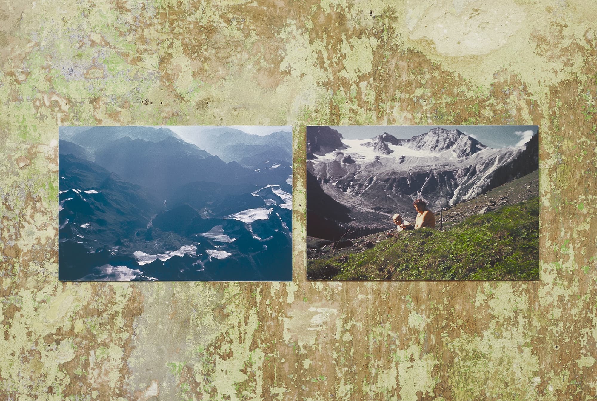 < Double Faces ( Snow Mountain ) > 2003 Cibachrome, framed, each of two parts 240×740mm, over all left photo : by artist Satoshi Otsuka right photo : purchased in the flea market in Berlin " Outing " 2003 Murata and Friends Berlin, Germany
