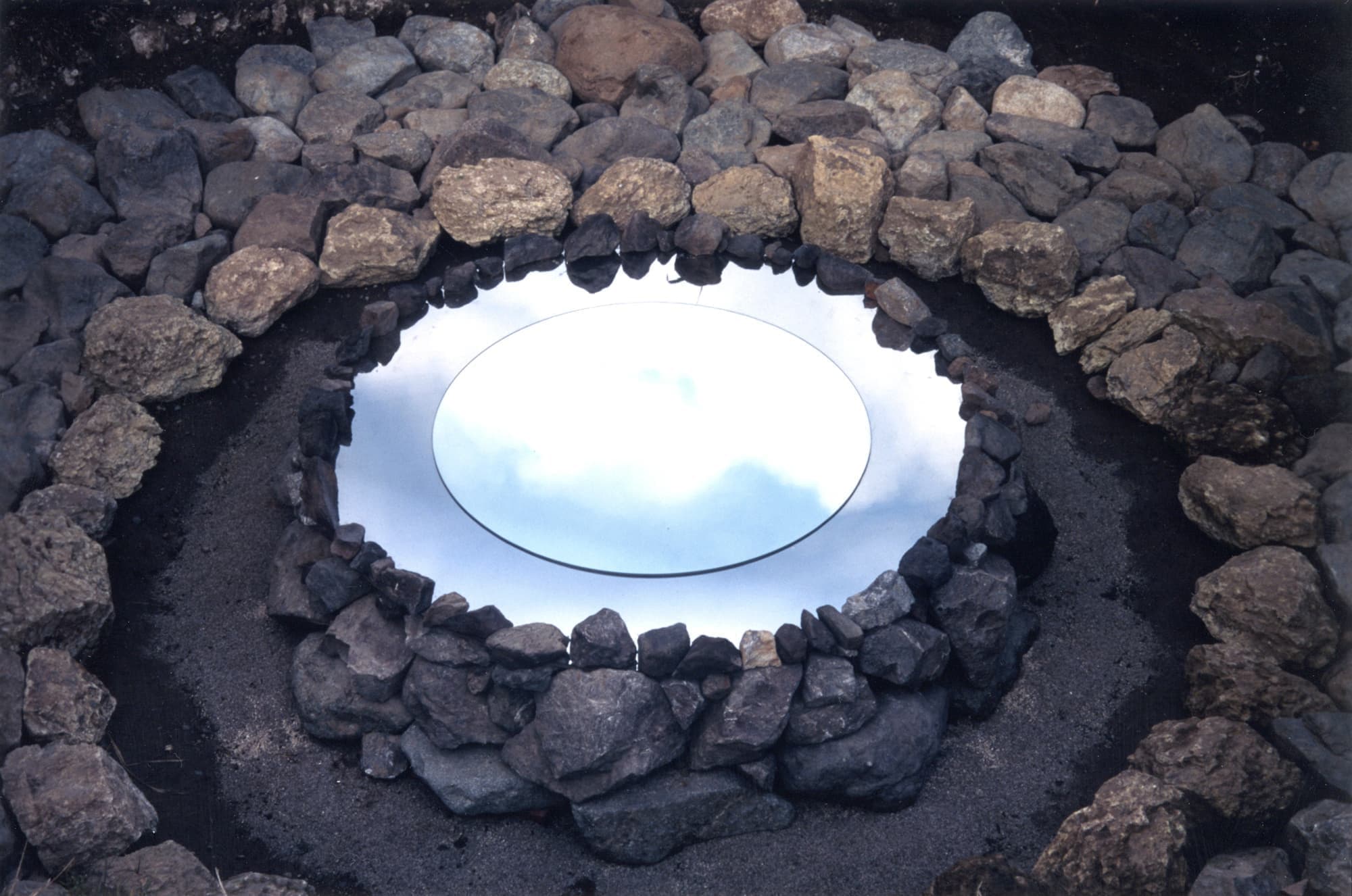 < HOLE > 1995 mirror, stainless steel, stone, strata ∅500×150cm " Field work in Fujino 1995 " 1995 Kanagawa, Japan
