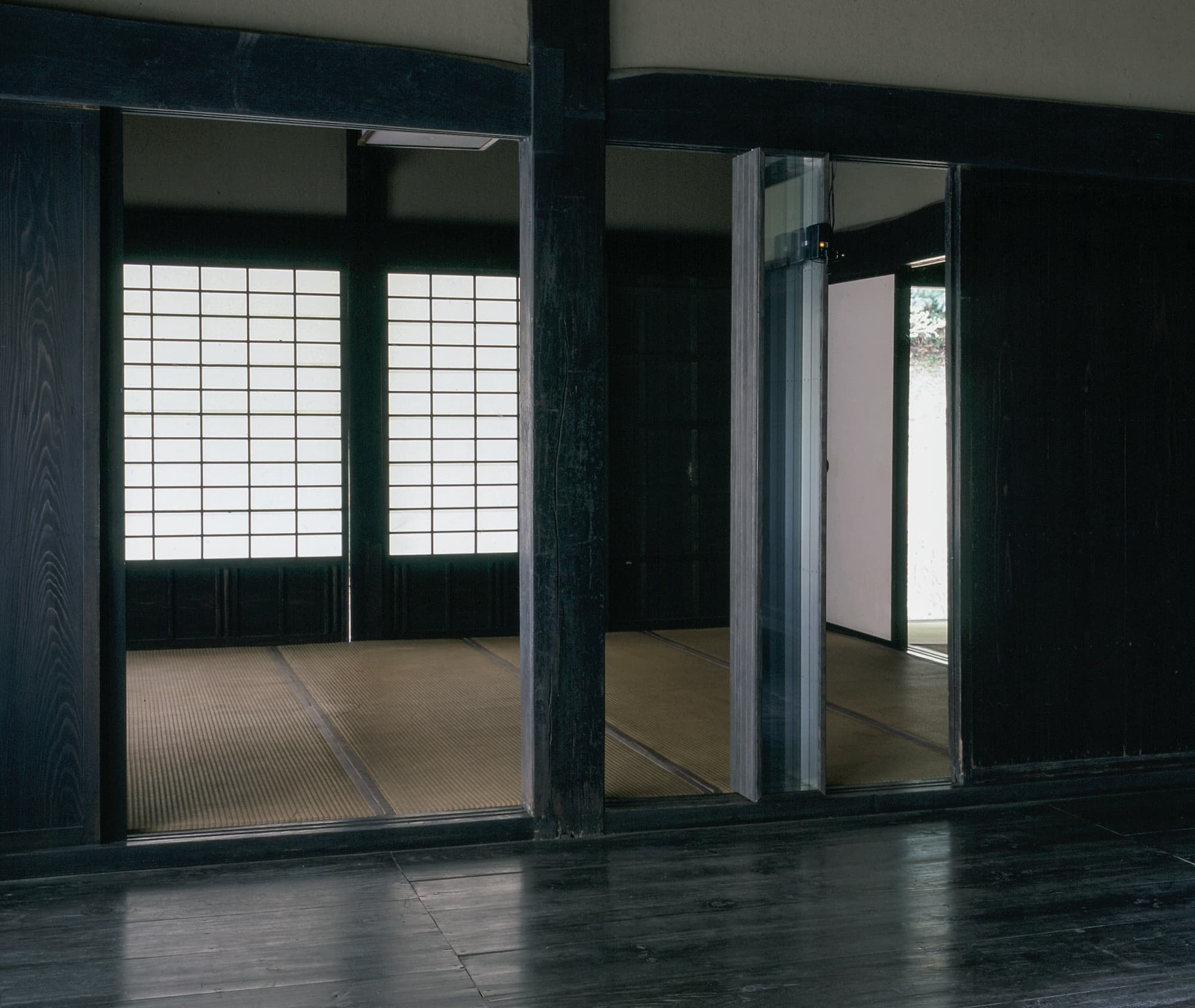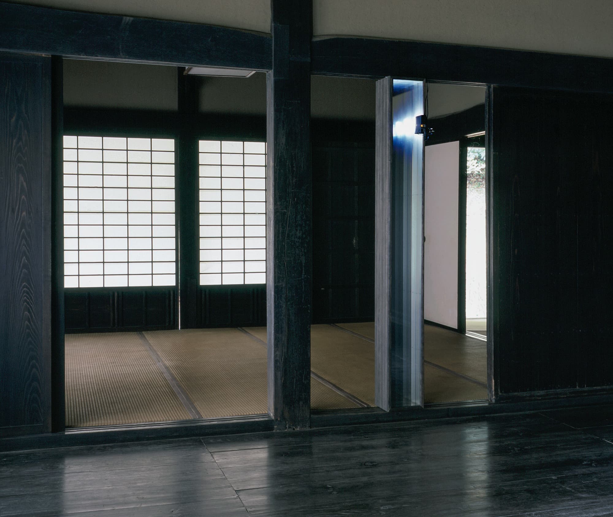 < Untitled > 2001 mirror, two-way mirror, storoboscope, infrared sencor, wooden frame 1900×180×200mm Photos : Masaru Yanagiba " Shibayama Art Exhibition 2001 " 2001 Chiba, Japan